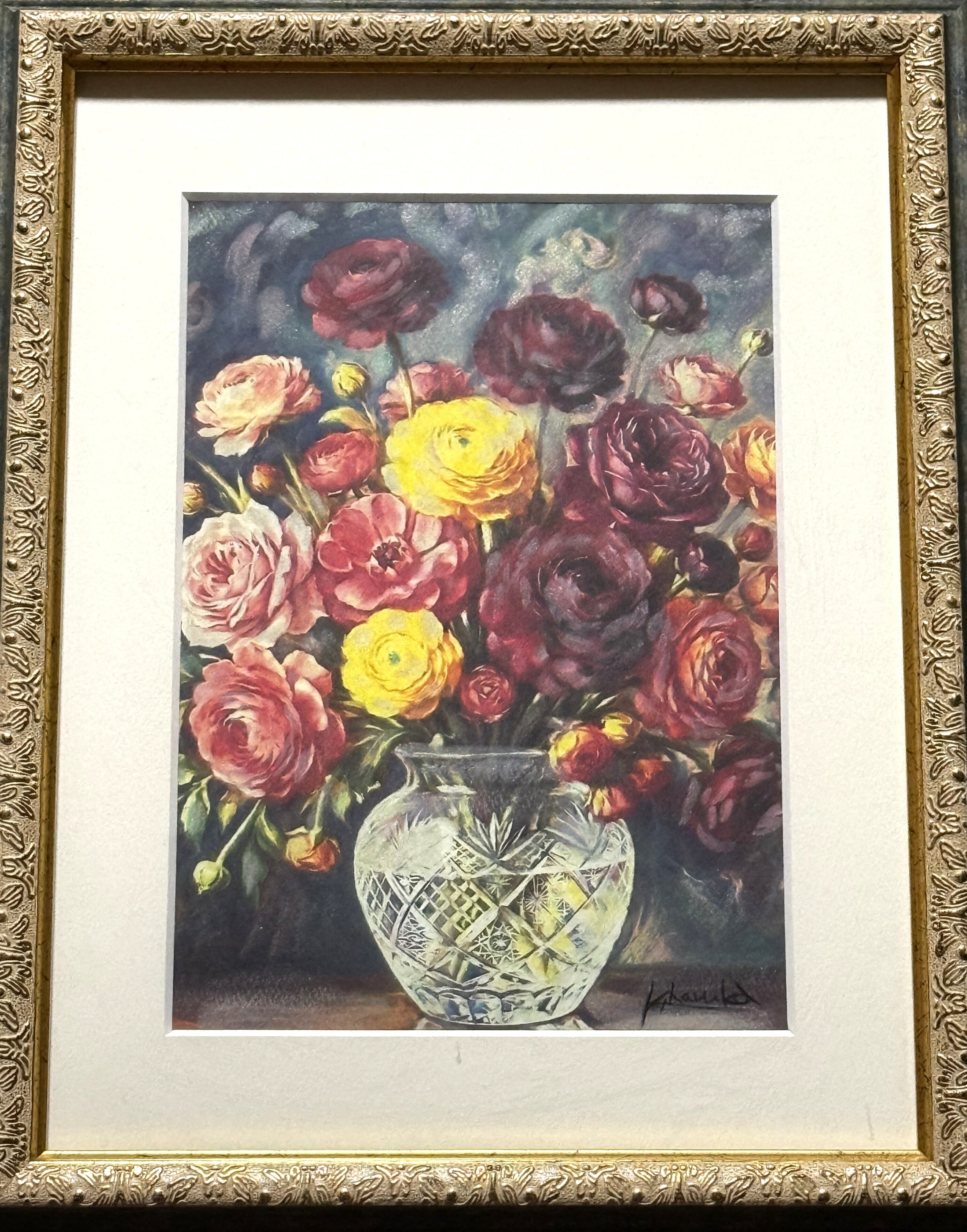 パステル画家 甲斐悠 作 「ラナンキュラスと切子」 A4サイズ 太子額